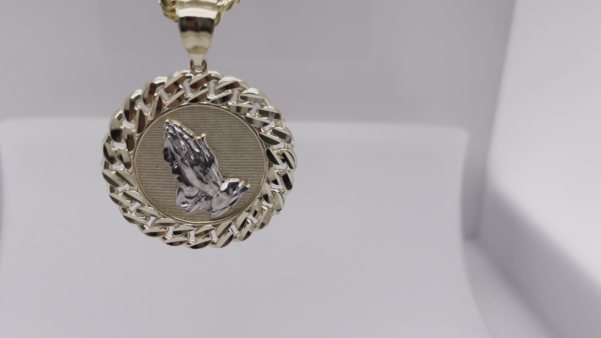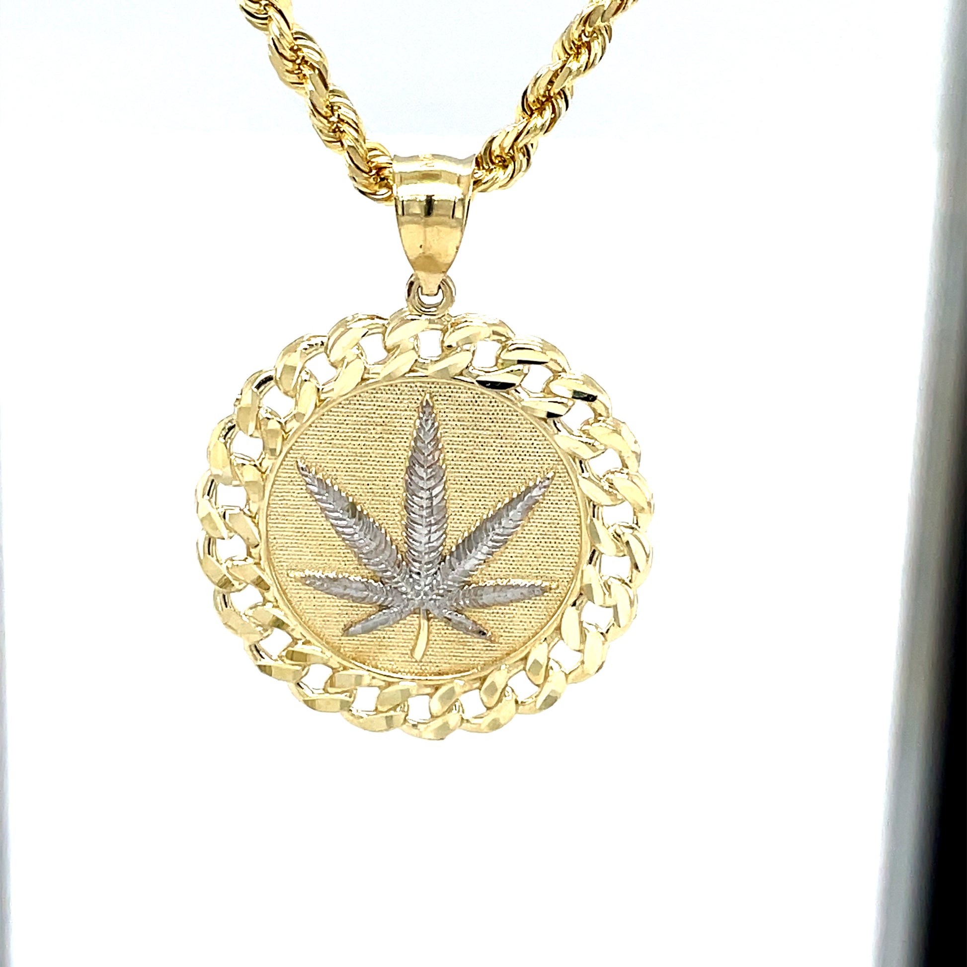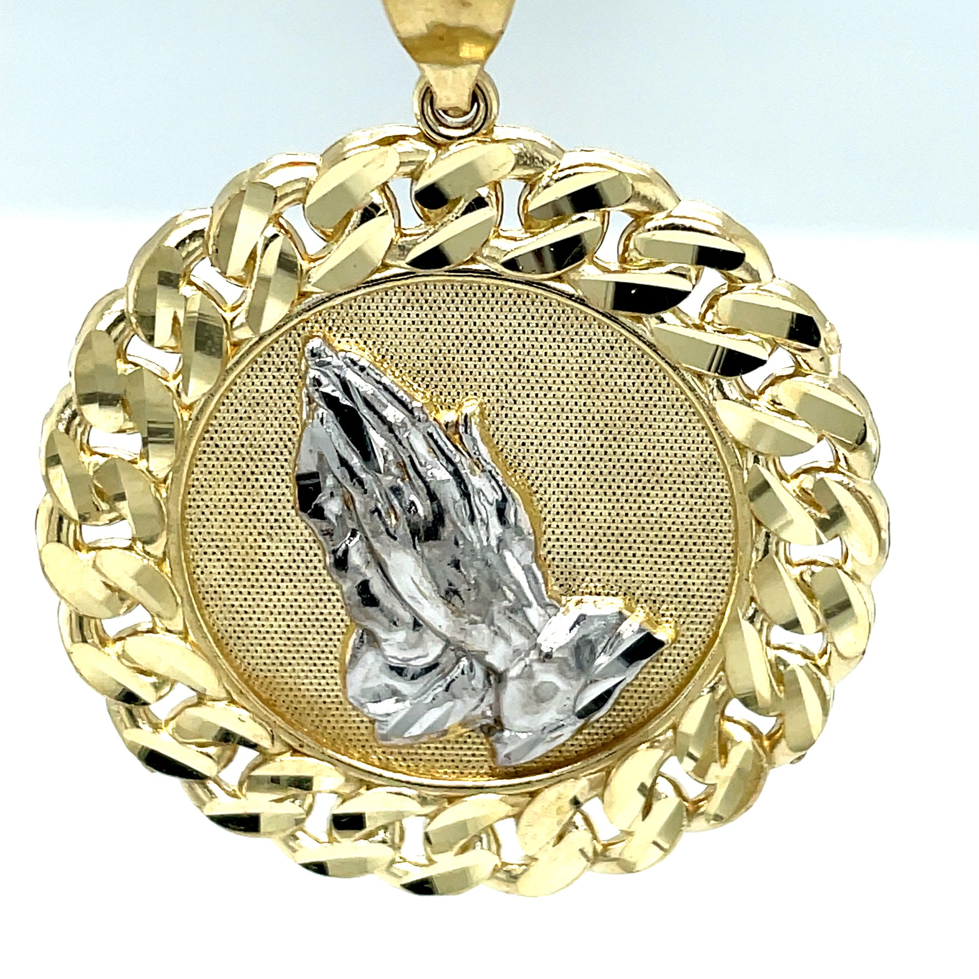 Elevate your jewelry collection with our versatile Round Medallion Pendant in 10KT Yellow Gold, available in a variety of artistic styles. Each pendant features a distinctive halo, crafted either in the bold Cuban link or the classic Greek link design, adding an extra layer of elegance and distinction. Choose from several captivating designs including the iconic $1 coin, serene praying hands, or vibrant plant symbols, among others. This medallion pendant makes a stunning addition to any outfit, whether you're looking to make a statement or add a touch of subtle sophistication to your everyday look. With 48 interest-free payments of $24.57, these pendants offer both beauty and affordability. Ideal for gifting or personal indulgence, our medallion pendants are crafted to be treasured for years to come.