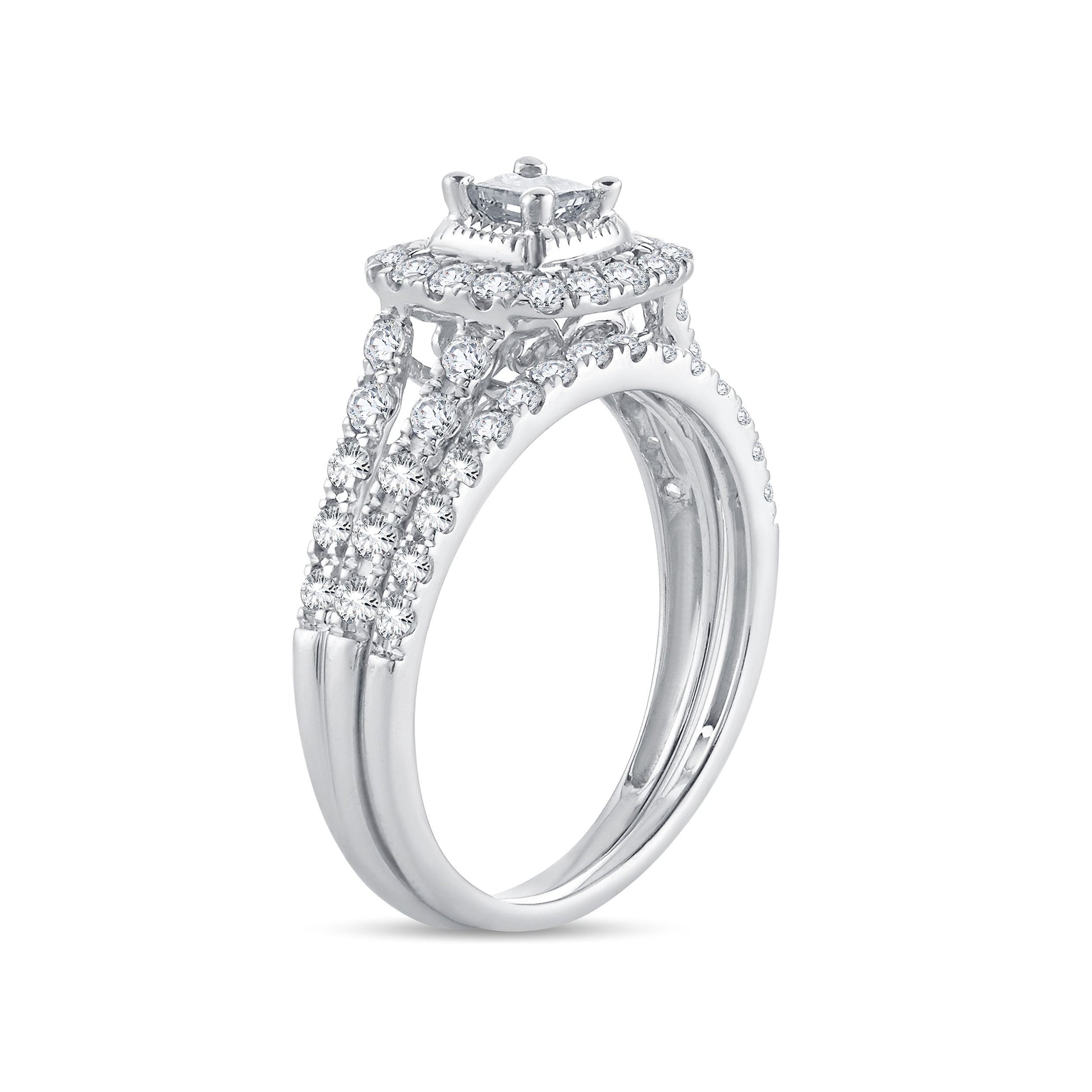 Our Cushion Cut Diamond Engagement Ring set in 14KT White Gold offers timeless elegance with a modern twist. This exquisite ring features a 1.00 carat cushion-cut diamond at the center, surrounded by a halo of shimmering round diamonds that enhance its brilliance and visual impact. The halo setting not only adds extra sparkle but also accentuates the cushion cut's unique soft edges, making the central stone appear larger and more luminous. Crafted with diamonds of clarity I1-I2 and color H-I, this ring is designed to catch the light beautifully, ensuring that it stands out. Perfect for those who appreciate sophisticated design and exceptional craftsmanship, this engagement ring with its accompanying band is ideal for marking a lifetime commitment. With 48 interest-free payments of $39.01, this stunning piece combines affordability with the luxurious appeal of high-quality diamonds, making your engagement truly memorable.