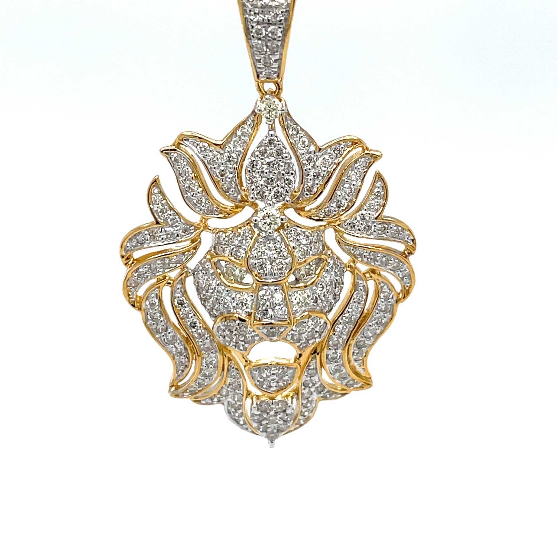 Our Diamond Lion Head Cutout Pendant offers a majestic design, expertly crafted in 10KT 3-Tone Gold. This impressive pendant captures the essence of royalty and strength, showcasing 1.42 carats of round cut diamonds beautifully set to outline the regal lion’s features. The pendant features a dynamic combination of yellow gold for the main structure, white gold for additional accents, and a striking rose gold crown, together creating a rich, multi-dimensional appearance.