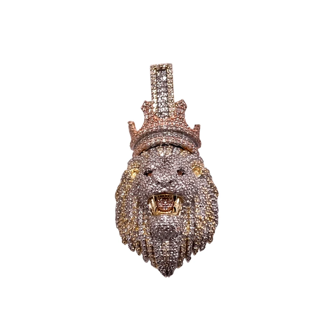 Our Diamond Lion Head Pendant, meticulously crafted in 10KT 3-Tone Gold, embodies strength and royalty. This stunning piece features 1.42 carats of round cut diamonds, intricately set across the majestic lion's mane and face, with 1494 diamonds enhancing the detailed craftsmanship. The lion's regal expression is crowned with rose gold, while the mane flows in elegant yellow and white gold, creating a striking visual contrast.