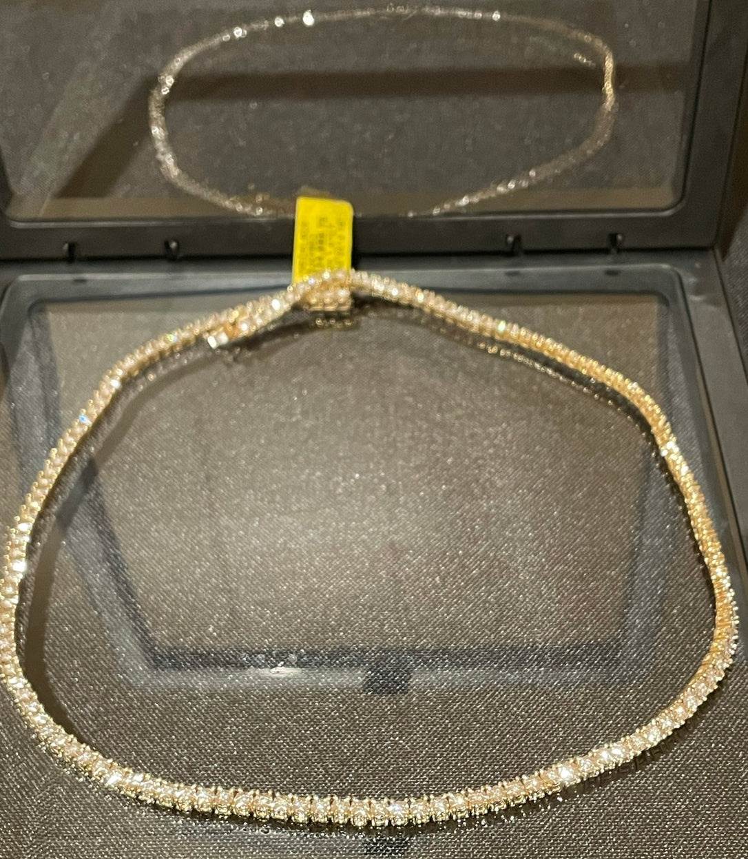 Our Diamond Tennis Necklace in 14KT Yellow Gold is the epitome of luxury and elegance. Featuring a total of 1.47 carats of round-cut diamonds, each meticulously set to showcase their brilliance and clarity (I1-I2) with a color grade of H-I. This exquisite piece wraps around your neck, displaying a continuous line of sparkling diamonds that catch the light with every movement. Designed to impress at any social gathering, this necklace will ensure you are the talk of the town. With 48 interest-free payments as low as $114.79, owning this magnificent piece of jewelry has never been more accessible. Whether attending a glamorous event or looking for a special gift, this tennis necklace is a true showstopper.